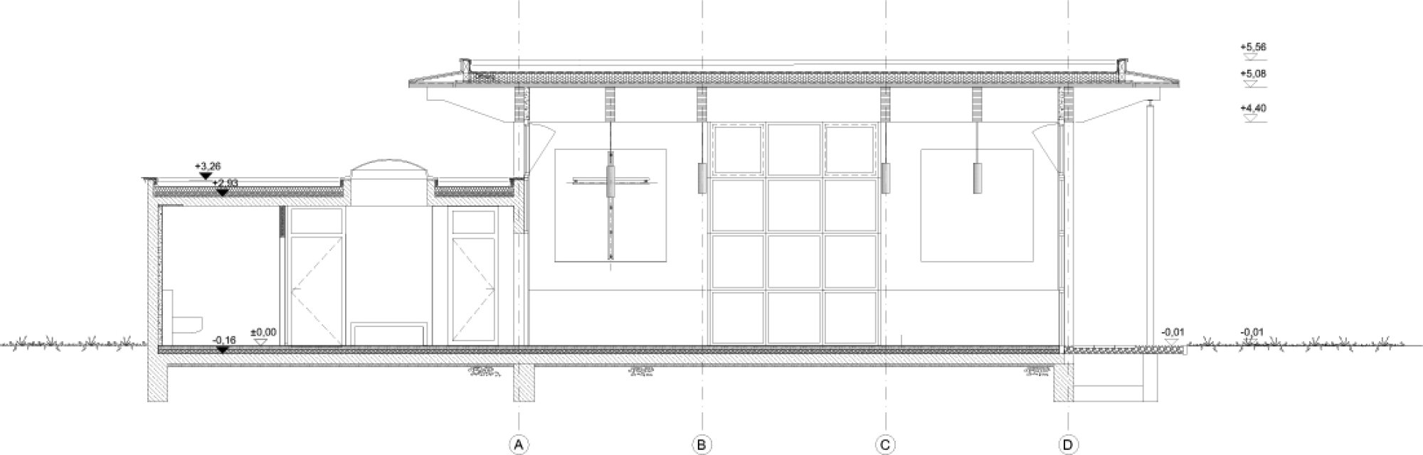 Die nach Osten orientierte Einsegnungshalle ist ein autonomer Baukörper und soll einen ruhigen Pol mit eigenem Charakter im Friedhofsareal bilden.