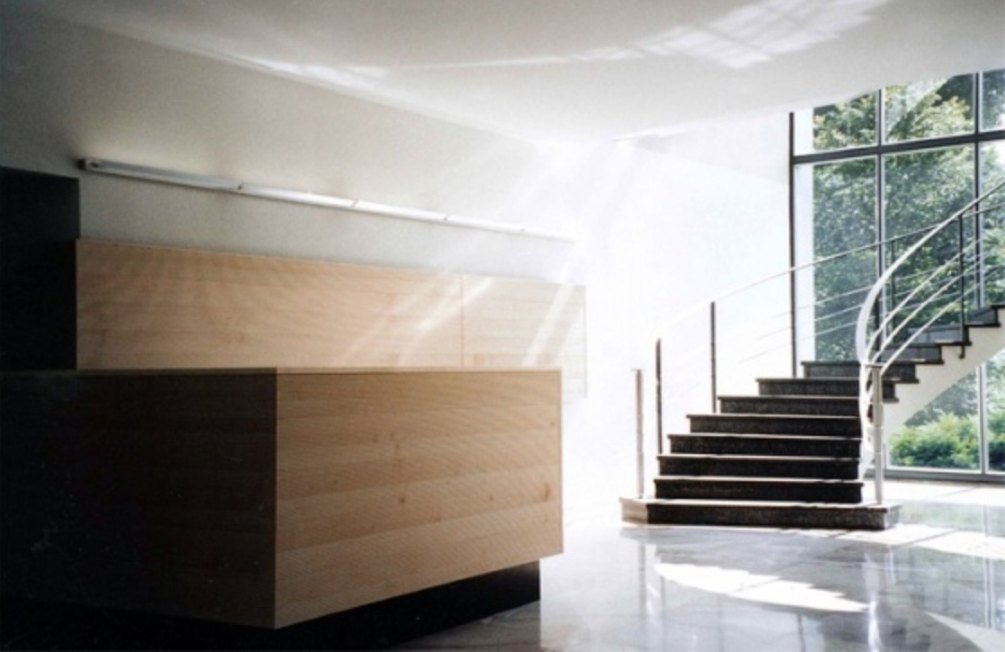 Das Verwaltungsgebäude – Bau 44 der Hoffmann-La Roche AG Grenzach- Wyhlen wurde in den 60er Jahren von Architekt Otto R. Salvisberg erbaut. In die räumlich gut proportionierte Eingangshalle mit einer repräsentativen filigranen Wendeltreppe wurde eine Empfangsstation für die Besucher gewünscht.