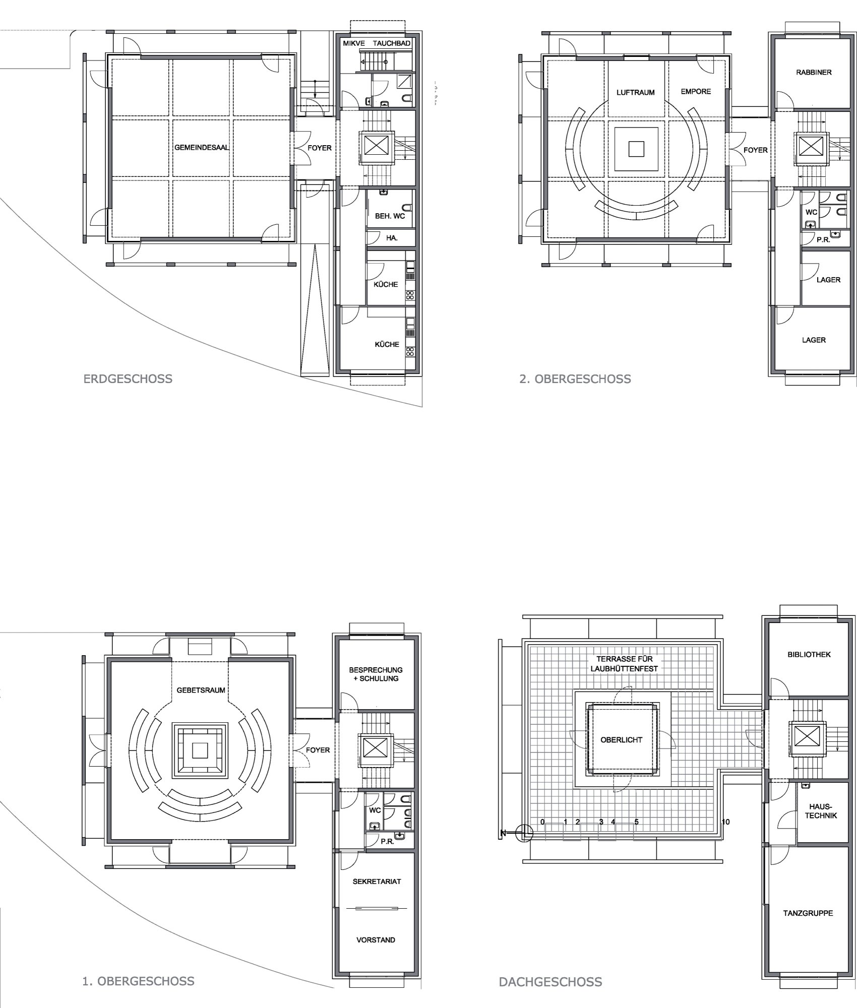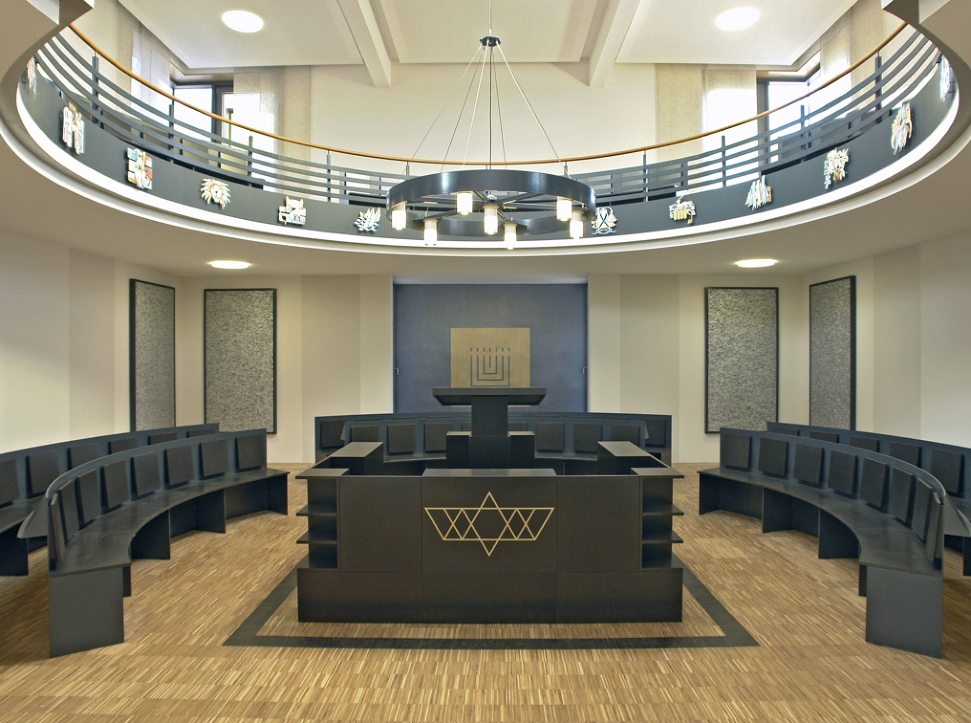 Wir wollten keine jüdische Architektur erfinden, sondern eine eigene, zeitgenössische Architektur mit jüdischen Bezügen generieren. Der Symbolwert dieser Synagoge bedeutete für uns Toleranz, Offenheit und Konzentration nach innen und außen. Wir haben den Ort und die Aufgabe mit einem würfelförmigen Kultbau belegt. Die Grundform des Quadrats soll als Integrität, der eingeschriebene Kreis der Frauenempore als die Unendlichkeit und der Kubus selbst als Autonomie verstanden werden. Der Kubus wird von einer zweiten Schale aus Sichtbetonscheiben umgeben. Diese Schale, einer Zwiebel vergleichbar, ist Schutzschild und Bedeutungsträger durch die angedeuteten jüdischen Symbole in geometrischen Spielformen des Davidsterns. Der Synagogenraum selbst ist als präziser Zentralraum entworfen worden. Der Almemor liegt in der Mitte, der Thoraschrein in einer mit Seitenlicht versehenen Ostnische und der Innenraum wird bekrönt von einem ebenfalls würfelförmigen, zenitalen Oberlicht. Die Frauenempore ist kreisrund mit einem offenen Teil nach Osten und verstärkt durch ihre Form das Zusammensein. Die segmentförmigen Bänke umgreifen den Almemor wie Hände einen Schatz.